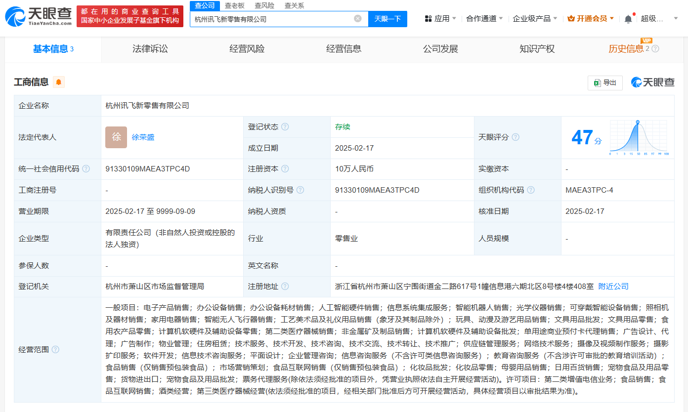 天眼查App显示,近日,杭州讯飞新零售有限公司成立,法定代表人为徐荣盛,注册资本10万人民币,经营范围包括电子产品销售、办公设备销售、办公设备耗材销售、人工智能硬件销售、信息系统集成服务、智能机器人销售等。股权全景穿透图显示,该公司由科大讯飞(002230)旗下安徽讯飞新零售有限公司全资持股。