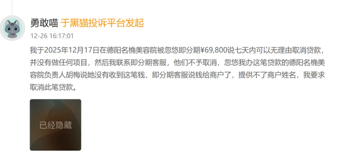 在黑猫投诉上,有用户投诉,2025年12月,在德阳名桷美容院被忽悠从即分期办理了一笔69800元的贷款,当时工作人员称七天内可以无理由取消贷款,但随后联系即分期客服时,对方表示不能取消,且表示已将贷款打给商户,但商户却表示从未收到贷款。