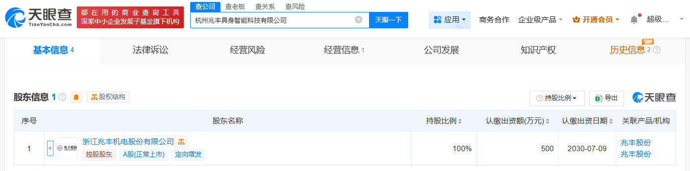 天眼查App显示,近日,杭州兆丰具身智能科技有限公司成立,法定代表人为孔辰寰,注册资本500万人民币,经营范围包括智能机器人销售、工业机器人销售、服务消费机器人销售等,由兆丰股份(300695)全资持股。