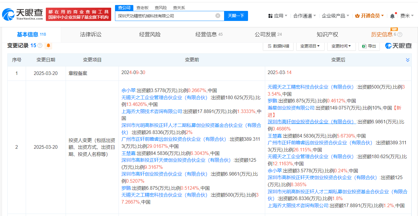天眼查App显示,近日,深圳天功精密机械科技有限公司发生工商变更,新增小米旗下瀚星创业投资有限公司为股东,同时注册资本由约1342万人民币增至约1491万人民币。
