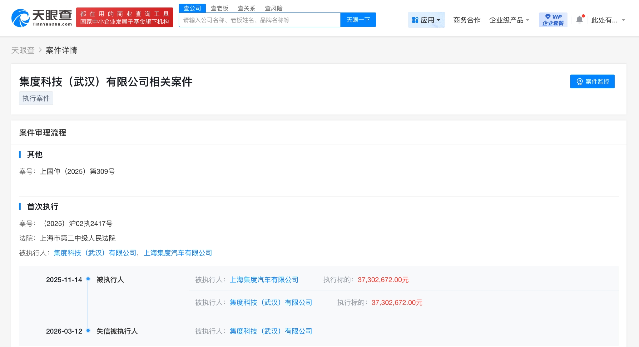 天眼查天眼风险信息显示,近日,集度科技(武汉)有限公司因有履行能力而拒不履行生效法律文书确定义务,被上海市第二中级人民法院列为失信被执行人(老赖),履行情况为全部未履行。案件流程信息显示,去年11月,该公司被执行3730万余元。