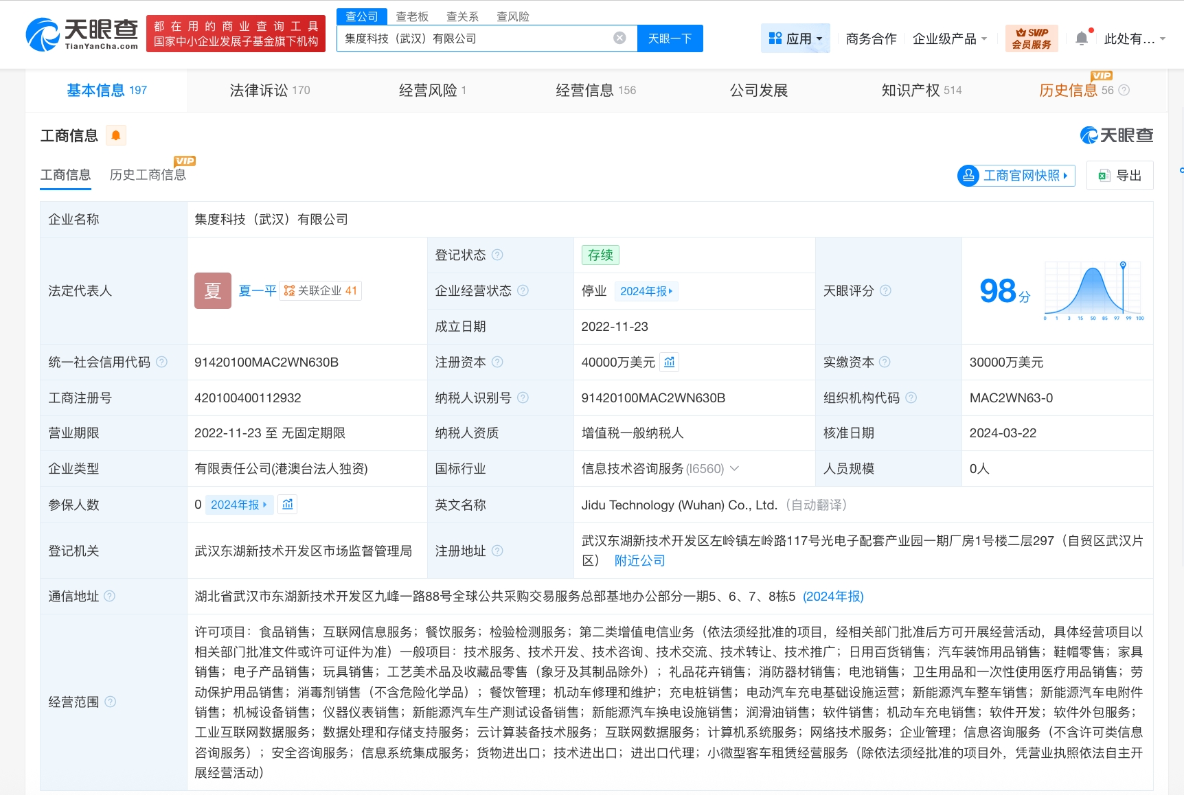 集度科技(武汉)有限公司成立于2022年11月,法定代表人为夏一平,注册资本4亿美元,经营范围包括技术服务、技术开发、技术咨询、技术交流、技术转让、技术推广,新能源汽车整车销售,软件开发等。股东信息显示,该公司由集度汽车(香港)有限公司全资持股。公开资料显示,集度科技为百度与吉利合资的智能汽车品牌“极越汽车”关联公司。