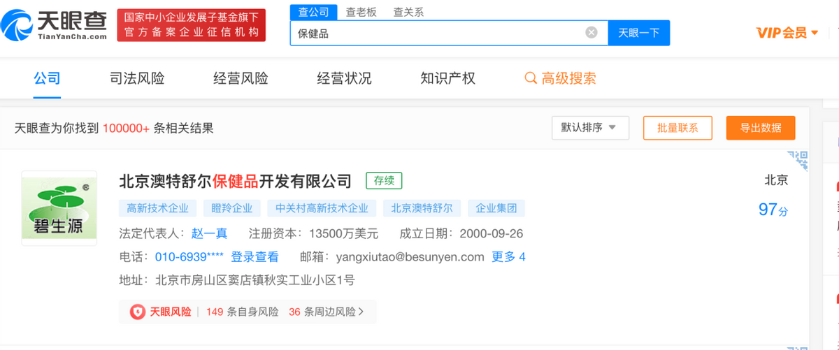 此外,保健品行业CR3值不高,汤臣倍健市场份额为10.3%,市场份额稳居第一。排名第二和第三的市场份额分别为6.0%与5.0%。据天眼查APP显示,搜索保健品行业有将近十万条相关结果。