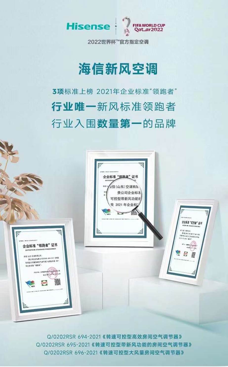 相比于国家或团体标准,入选“领跑者”名单的企业标准更为苛刻。Q/0202RSR 695-2021《转速可控型带新风功能的房间空气调节器》做为行业仅有入围的新风空调企业标准,也再次印证了海信在新风领域的实力。