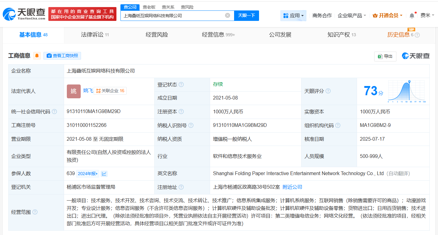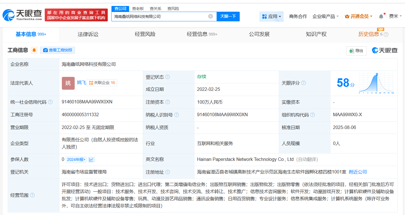 天眼查App显示,近日,海南叠纸网络科技有限公司发生工商变更,刘辰西卸任法定代表人、执行董事兼总经理,姚飞接任法定代表人,并担任董事。