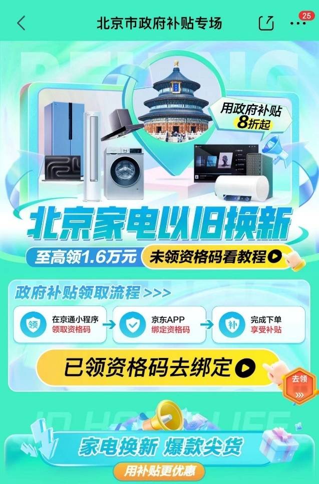 京东平台的参与方法为:打开手机京东APP,搜索“北京家电以旧换新”即可进入活动页面。用户需通过微信“京通”小程序领取资格码,收货地址需选“北京”。