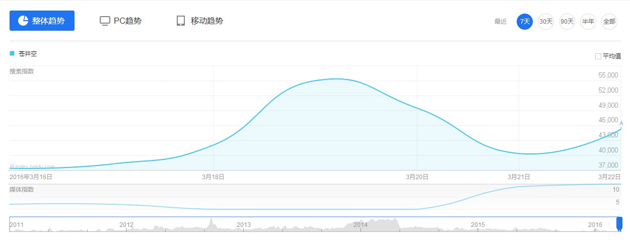 从网络热度看。苍井空的百度热搜指数,和最近比较火的宋仲基、奶茶妹妹的搜索指数,是不相上下的。
