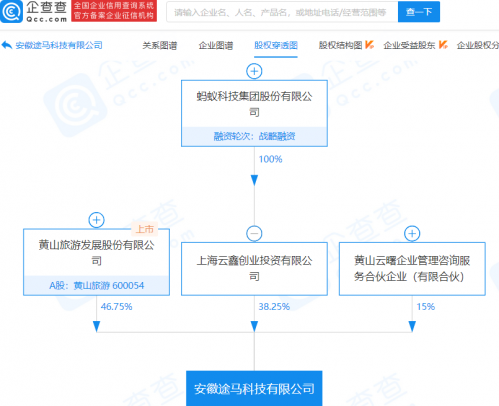 企查查股权穿透显示,该公司由黄山旅游(600054)、蚂蚁科技集团股份有限公司子公司上海云鑫创业投资有限公司、黄山云曙企业管理咨询服务合伙企业(有限合伙)共同持股。