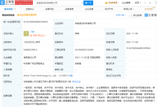 【TechWeb】企查查APP显示,11月8日,安徽途马科技有限公司成立,法定代表人为丁维,注册资本1.2亿元人民币,经营范围包含:第二类增值电信业务;互联网信息服务;旅游业务;食品互联网销售等。
