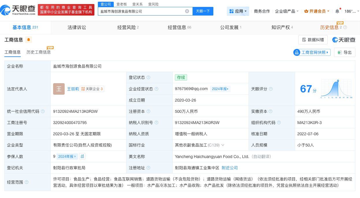 天眼查App显示,遭315晚会曝光的盐城市海创源食品有限公司成立于2020年3月,法定代表人为王丽莉,注册资本500万人民币,经营范围包括食品生产、水产品冷冻加工、水产品收购、水产品批发等。股东信息显示,该公司由王丽莉、王兵共同持股。行政处罚信息显示,2025年5月,该公司因标签标识不符合规定及生产经营管理不符合要求,被射阳县市场监督管理局罚款约69.9万元,没收违法所得约14万元。