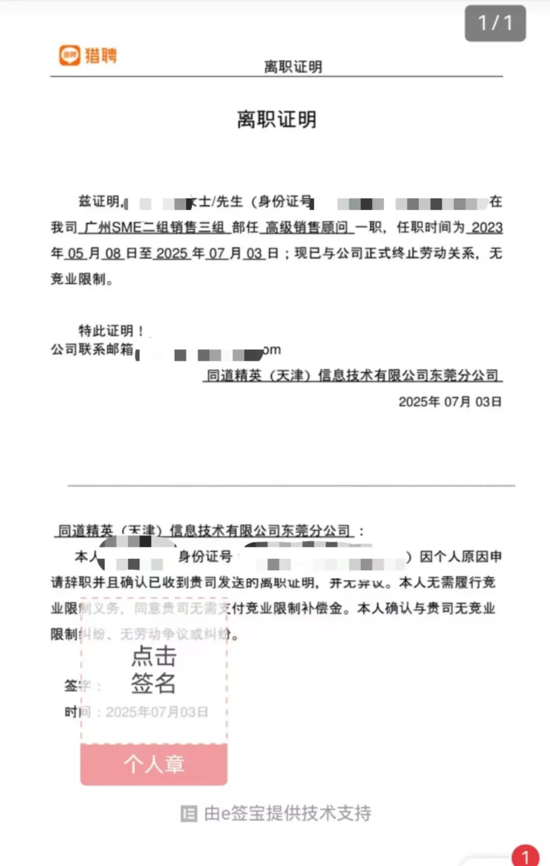 猎聘公司于7月3日向郑女士发送的电子离职证明显示,郑女士任职时间为2023年5月8日至2025年7月3日,离职原因是个人原因申请辞职,郑女士表示不承认这个说法,自己并未主动申请辞职,也并未得到应有的赔偿。