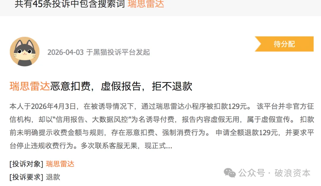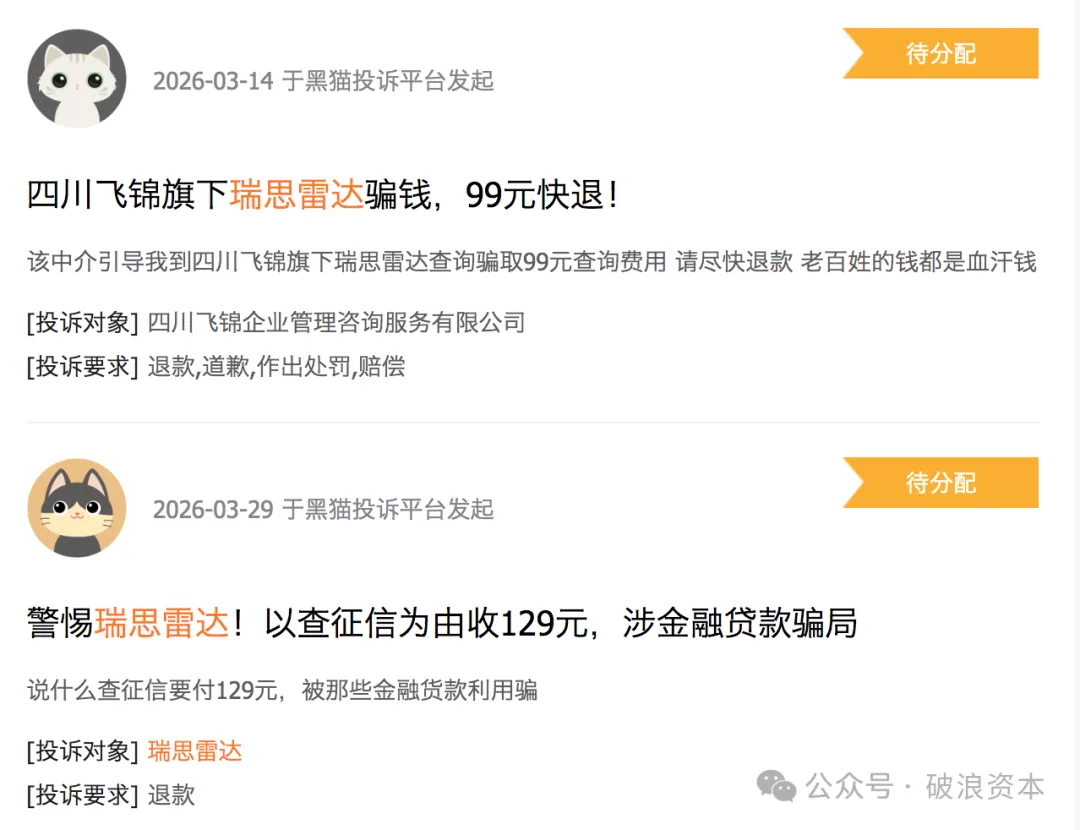 破浪资本在黑猫投诉平台看到,大量用户反映,支付费用后不仅未能获得贷款,所交费用也无法退还。天眼查显示,“瑞思雷达”运营主体为四川云果未来科技有限公司,注册资本仅100万元,与多家贷款黑中介存在关联。