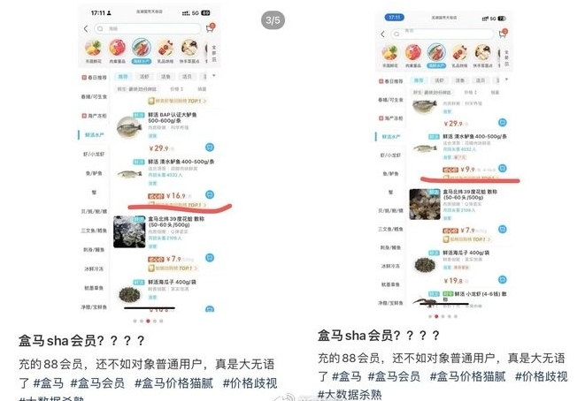 除刘文外,不少用户在社交平台反映盒马“大数据杀熟”现象,有用户举例,“同样的手机、同样的地点、同样的APP、同样的产品,盒马会员日,会员88折打完价格与非会员一样。”另有网友以一条400g到500g的鲜活清水鲈鱼举例,X会员价格为16.9元,普通用户价格为9.9元,并发文称“充了盒马88会员,还不如普通用户。”
