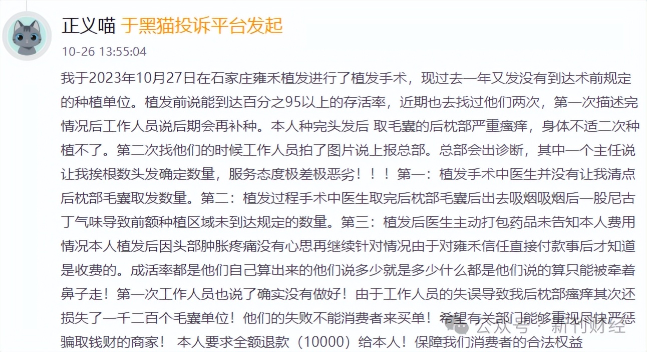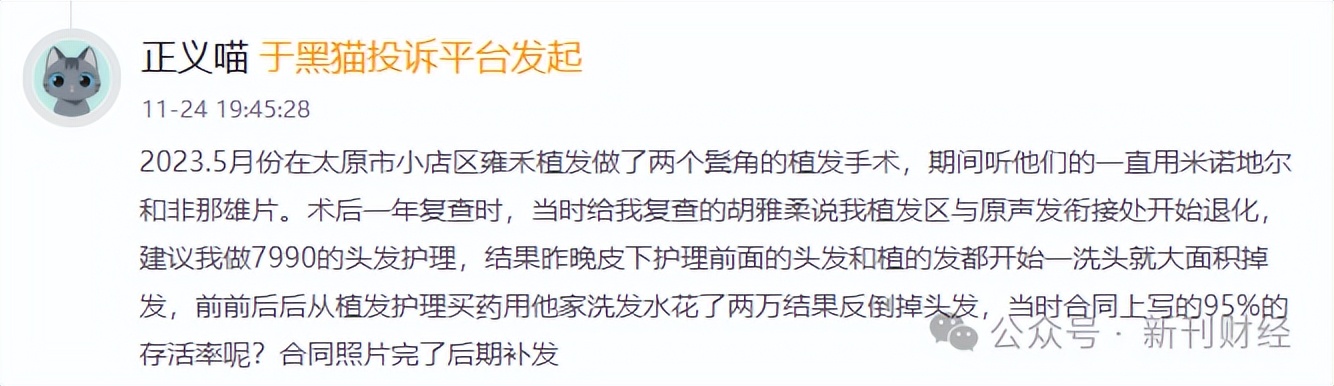 资料显示,作为“植发第一股”,雍禾医疗曾凭借“雍禾植发五大保障协议书”——涵盖手术预约、收费透明、医生负责制、毛囊成活率90%-95%以及全国联保等核心条款,成功构建患者信任壁垒。然而,近期黑猫投诉平台披露的多起用户反馈,却使其医疗专业性与服务可靠性备受质疑。