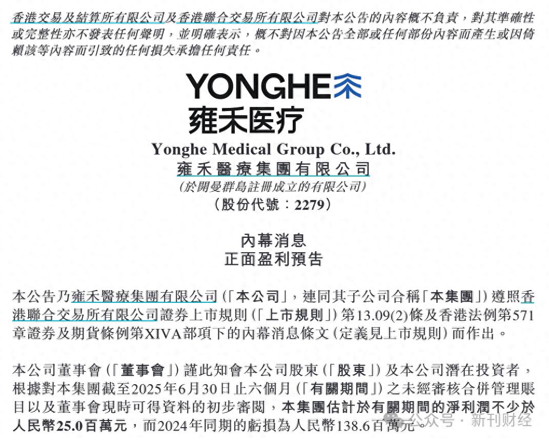 7月29日,雍禾医疗(2279.HK)发布2025年上半年正面盈利预告。内容显示,根据对雍禾医疗截至2025年6月30日止六个月之未经审核合并管理账目以及董事会现时可得资料的初步审阅,公司估计2025年上半年的净利润不少于2500万元,而2024年同期为亏损1.386亿元。