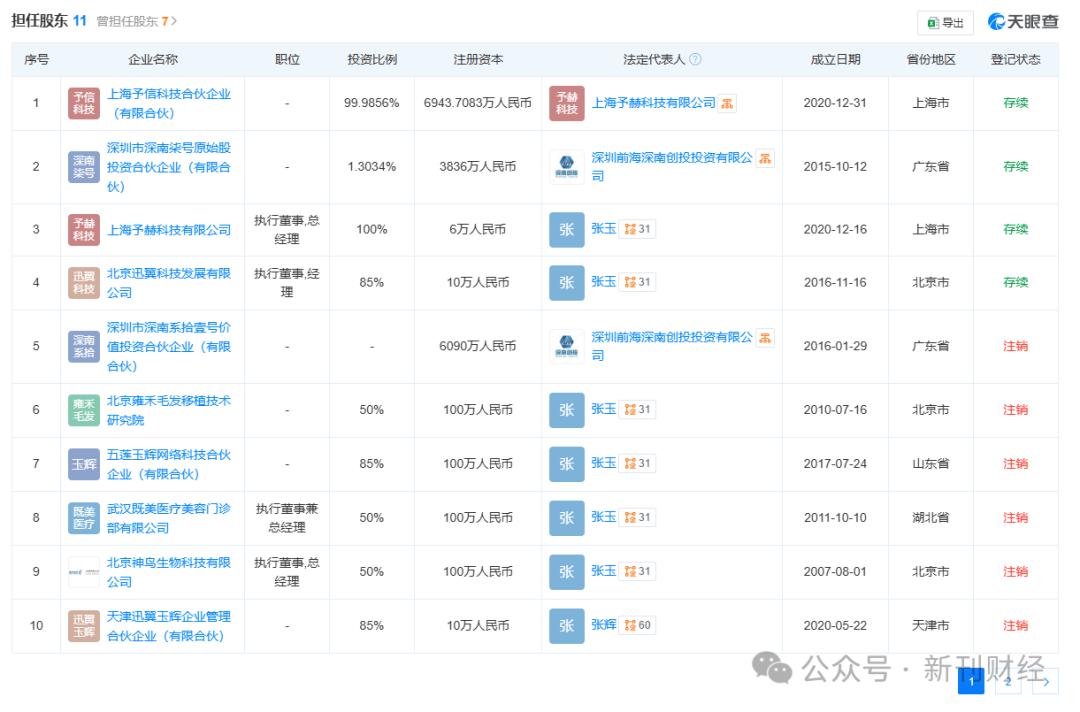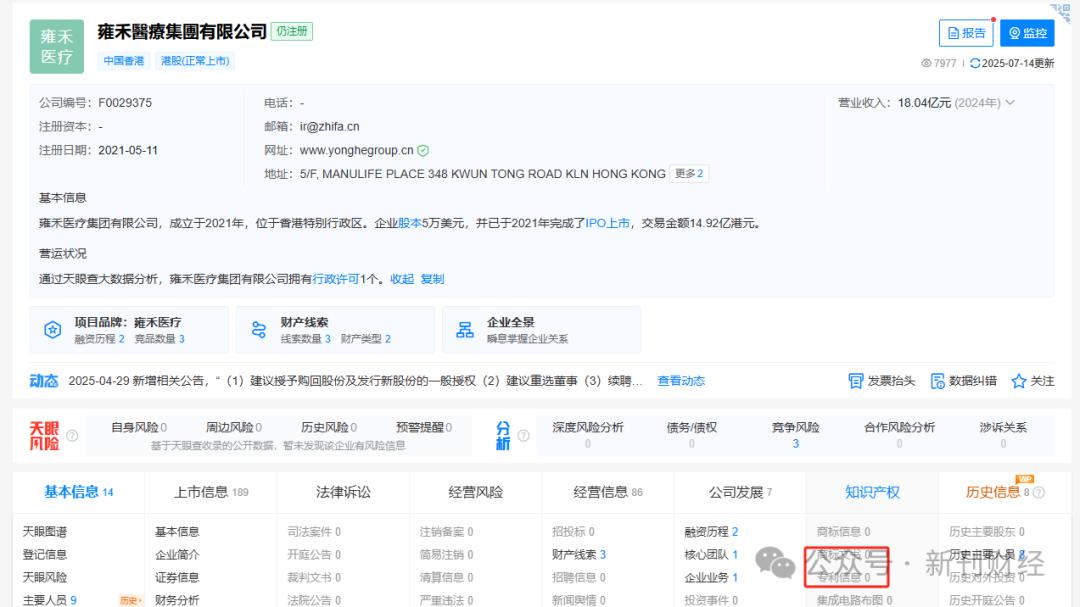 天眼查平台信息显示,雍禾医疗集团有限公司名下未持有任何商标文书或专利信息。同时,在雍禾植发实际控制人张玉担任股东的11家公司中,7家已处于注销状态,1家投资占比较低,其余3家控股企业——予信科技、予赫科技、迅翼科技,同样未查询到相关商标及专利文书记录。此外,从研发投入来看,雍禾医疗2024年研发支出仅为2125万元,占营收比重1.2%,甚至较2023年同期还大幅减少约800万元。这一系列数据表明,雍禾医疗或在技术创新投入方面存在明显短板,进一步加剧了市场对其产品迭代能力与植发技术竞争力的担忧。