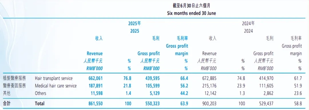 具体来看,植发医疗服务贡献了6.62亿元的营收,医疗养固服务1.88亿元、其他1159.8万元。植发医疗服务收入占营收的比重为66.4%,比2024年同期的61.7%提高了4.7个百分点,但是收入相比2024年上半年的6.73亿元减少了0.11亿元。医疗养固服务收入下降得更多,已经从2024年同期的2.15亿元减少至2025年上半年的1.88亿元。