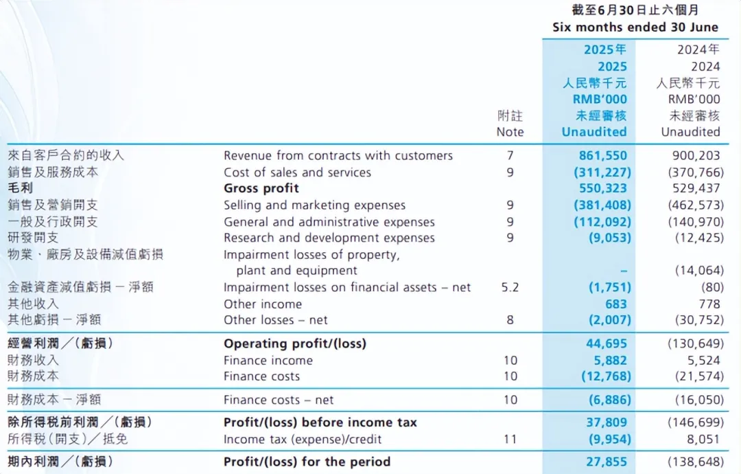 具体而言,销售及服务成本方面,员工成本从2024年同期的1.42亿元降至2025年上半年的1.26亿元;一般行政及开支方面,员工成本从9748.3万元降至7864.8万元;销售及营销开支方面,员工成本从1.2亿元降至1.1亿元。