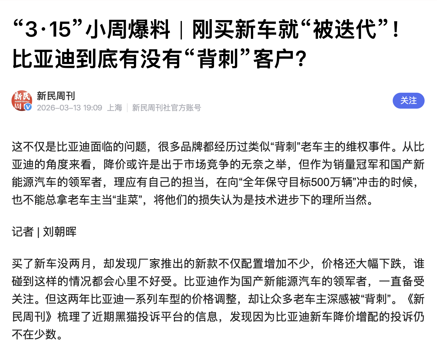 据新民周刊报道,2025年2月,比亚迪发出“全民智驾”宣言,推出的系列新车搭载“天神之眼”高阶智驾系统,支持高速NOA、代客泊车等核心功能,售价却与老款持平。让老车主难以接受的是,由于硬件差异(缺乏高算力芯片、激光雷达等),老款车型根本无法通过升级获得这些功能。一场技术盛宴,却成了老车主的“集体追悼会”。而此前,销售们还在以“短期内无重大改款计划”、“2024款为最新主力车型”等销售话术诱惑消费者“上车”。