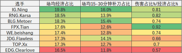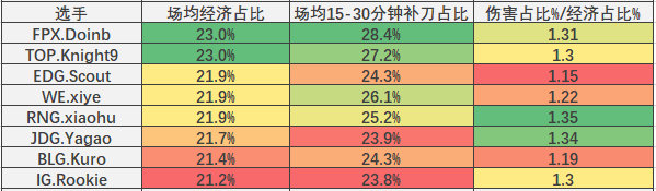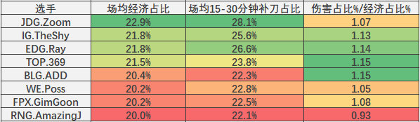 从数据上来看,场均经济占比最高的WE战队的Mystic,达到了24.4%,该名选手的场均15-30分钟补刀占比31.4%,伤害占比%/经济占比%为1.26;场均15-30分钟补刀占比最高的是RNG战队的Uzi,达到了33.4%,其场均经济占比为24.2%,伤害占比%/经济占比%为1.19。