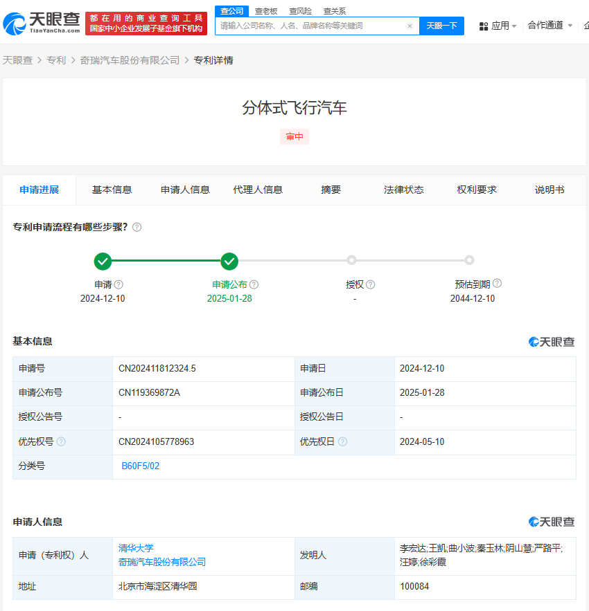 天眼查App显示,近日,清华大学、奇瑞汽车股份有限公司申请的“分体式飞行汽车”专利公布。