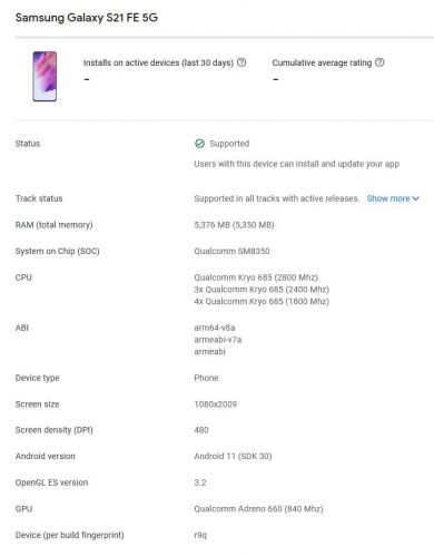 骁龙888小屏旗舰来了!三星Galaxy S21 FE 5G现身Google Play快报