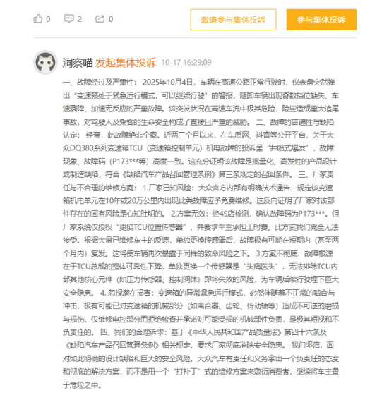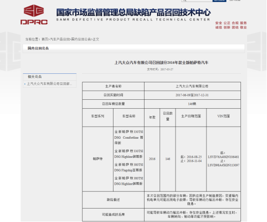 记者查阅国家市场监督管理总局公开信息发现,上汽大众曾因变速箱机电单元缺陷多次实施召回。2017年至2024年间,该公司先后召回多款搭载同类变速箱的车型,涉及问题包括“机电单元上壳体螺纹开裂导致油压下降”“离合器耦合失效引发失速”等,与当前车主投诉的故障现象高度相似。