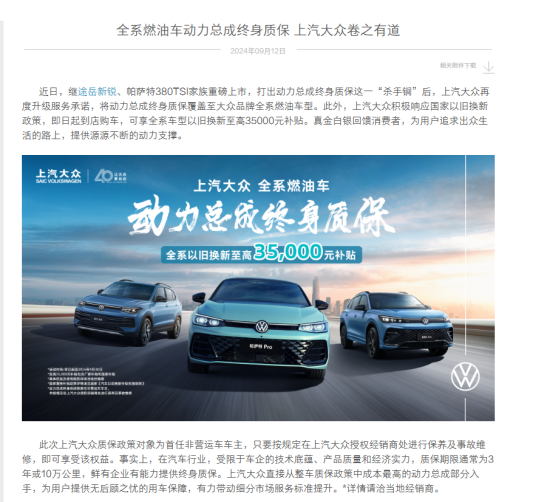 更值得关注的是,大众曾宣传DQ380等湿式双离合变速箱 “离合器浸在冷却油液内,不会出现过热问题”,以此化解早年干式DSG风波,且记者仍可在上汽大众官网搜索到其2024年9月发布的 “全系燃油车动力总成终身质保”的相关文章。但田先生等车主在修车时,4S店却告知其不能享受到该文章所宣称的质保服务。有车主直言,不管是质保、优惠政策的适用条件,还是各地 4S 店相关政策的下达执行,大家都一头雾水。“现在没人能真正弄清,到底该怎么处理才合适。我们咨询过 4S 店和 400 售后热线,可他们一开口就说过保了。” 田先生无奈地说道。