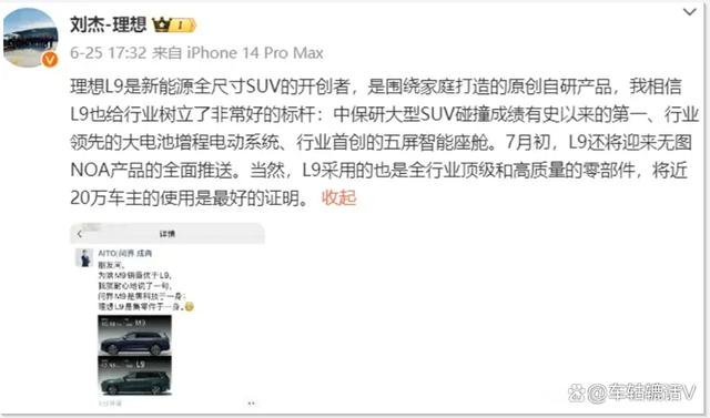 刘杰称,理想L9是新能源全尺寸SUV的开创者,L9采用的也是全行业顶级和高质量的零部件,将近20万车主的使用是最好的证明。