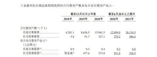 上市文件显示,截止6月30日的2021年上半年,网易云音乐在线音乐服务的月付费用户数为2613.5万人,同比增长101.1%;每月每付费用户收入却从去年同期的9.3元下降至6.8元,这也是自2018年以来的最低水平。