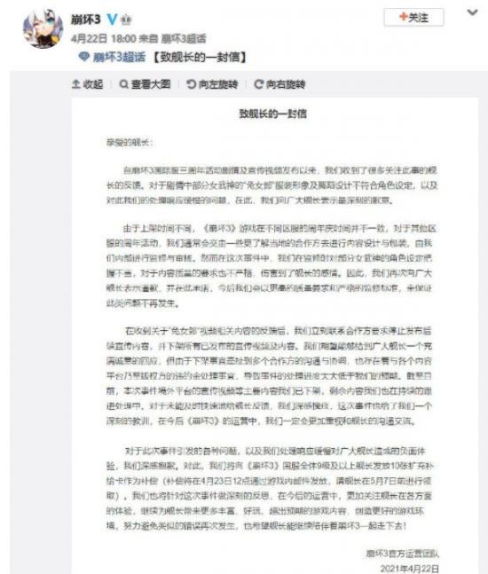 4月22日,官方顶不住游戏内外压力发布千字道歉长文。