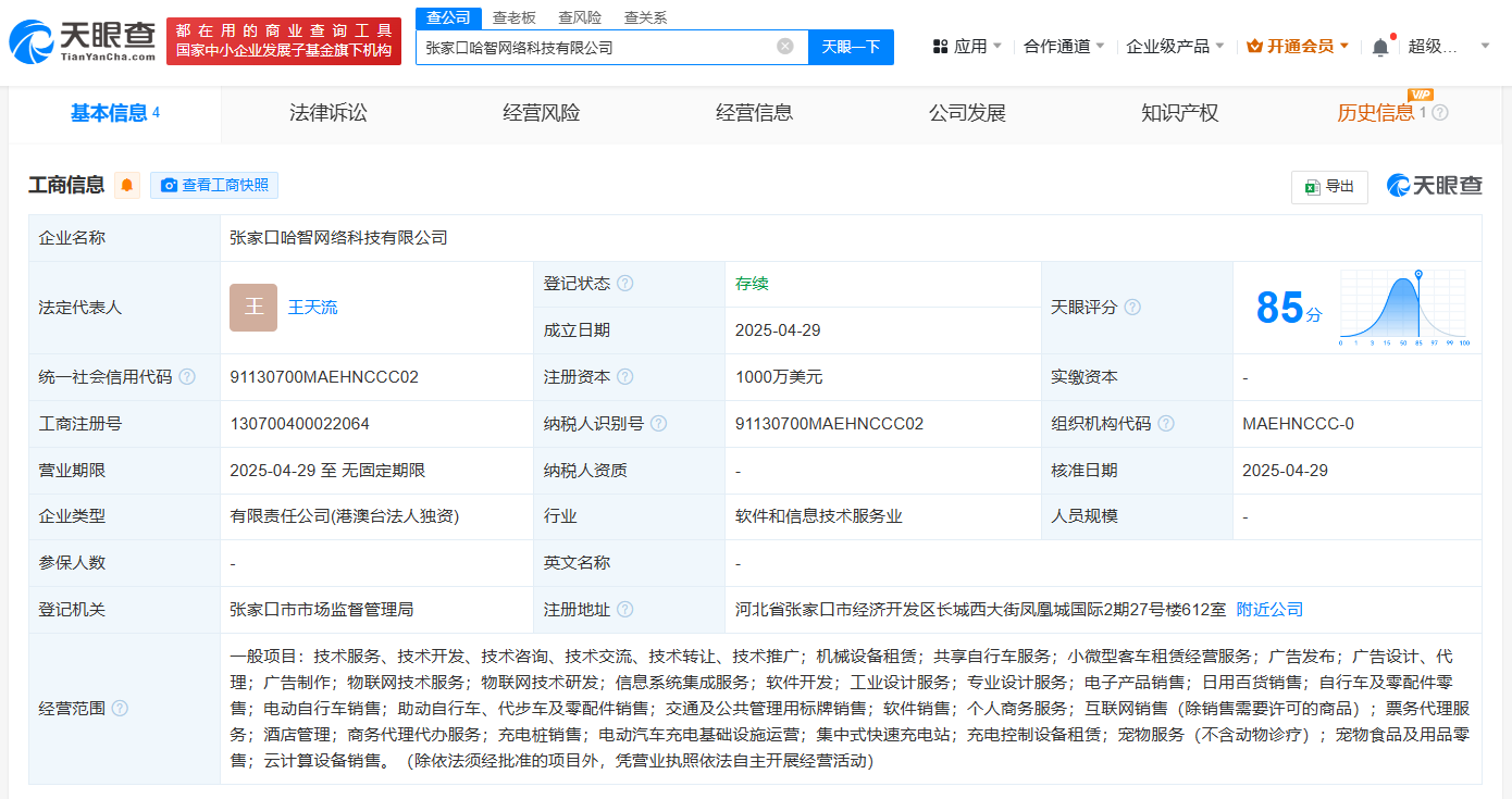 近日,张家口哈智网络科技有限公司成立,法定代表人为王天流,注册资本1000万美元,经营范围包括共享自行车服务、小微型客车租赁经营服务、物联网技术服务、物联网技术研发等。
