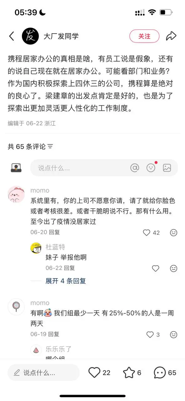 2025 年 9 月,携程发布内部邮件称自今年 9 月 1 号起,居家办公无需直属领导审批,提交即视为自动通过。邮件中提到,自 2022 年居家办公政策推出以来,已有 70% 的员工参与,在家办公累计 64 万左右人次。