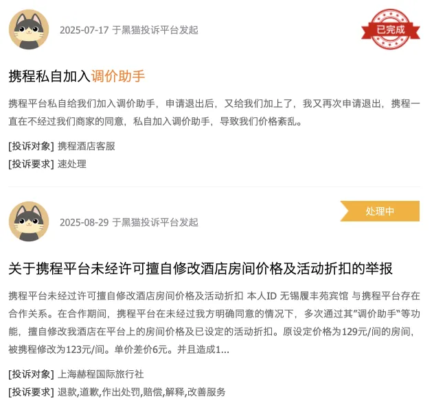 黑猫投诉上也有诸多携程调价助手自动改价、无法关闭等相关投诉信息,可见这不是携程第一次对商户“动刀”。