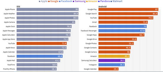 Comscore的调查结果显示,在美国市场,iOS榜单上排名前20的应用中,有 75%是由苹果开发的。而在Android榜单上排名前20的应用中,60%是由谷歌开发的。