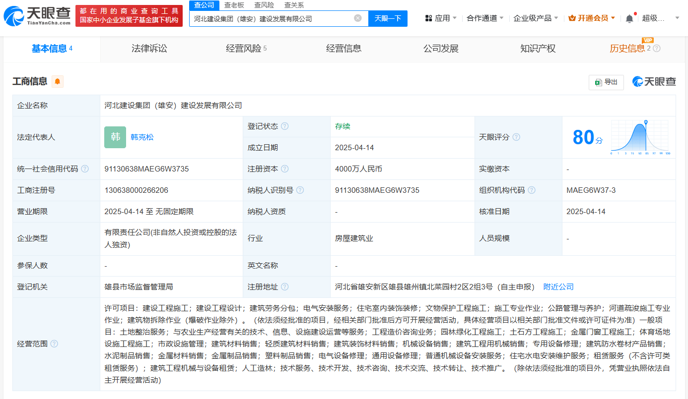 天眼查App显示,近日,河北建设集团(雄安)建设发展有限公司成立,法定代表人为韩克松,注册资本4000万人民币,经营范围包括建设工程施工、建设工程设计、建筑劳务分包、电气安装服务、住宅室内装饰装修等。股东信息显示,该公司由河北建设(HK.01727)全资持股。
