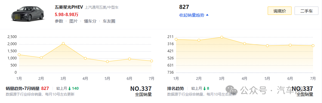 此外渠道上五菱的表现也难称强势,三四线城市服务半径过大,促销沦为价格战,宏光MINIEV在第三方平台来看,经销商报价已低至2.58万元起,但月销也一直没有突破3万辆大关,很难不认为消费者已经对其产品力产生不满。另外,由于五菱品牌长期沉浸在下沉市场,难免会被消费者钉上“工具车”的标签,这也导致了星光S等中高端车型因溢价缺失惨遭滞销。