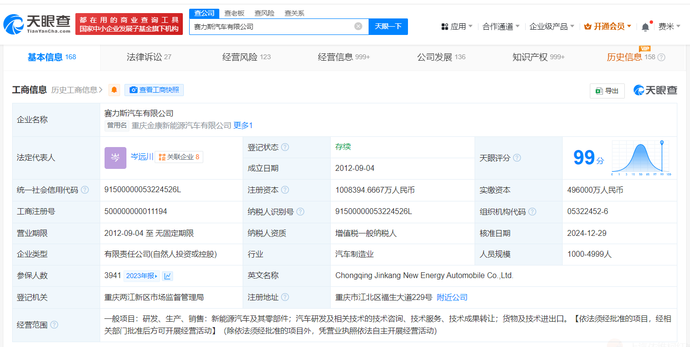 赛力斯汽车有限公司成立于2012年9月,法定代表人为岑远川,注册资本约100.8亿人民币,经营范围含汽车研发及相关技术的技术咨询、技术服务、技术成果转让等,由赛力斯集团股份有限公司、国开制造业转型升级基金(有限合伙)共同持股。