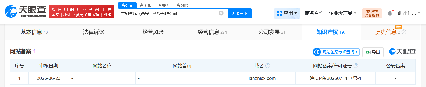 天眼查App显示,近日,兰知春序(西安)科技有限公司新增一则网站备案信息,域名为“lanzhicx.com”,审核日期为6月23日。目前,该网站暂时无法打开。