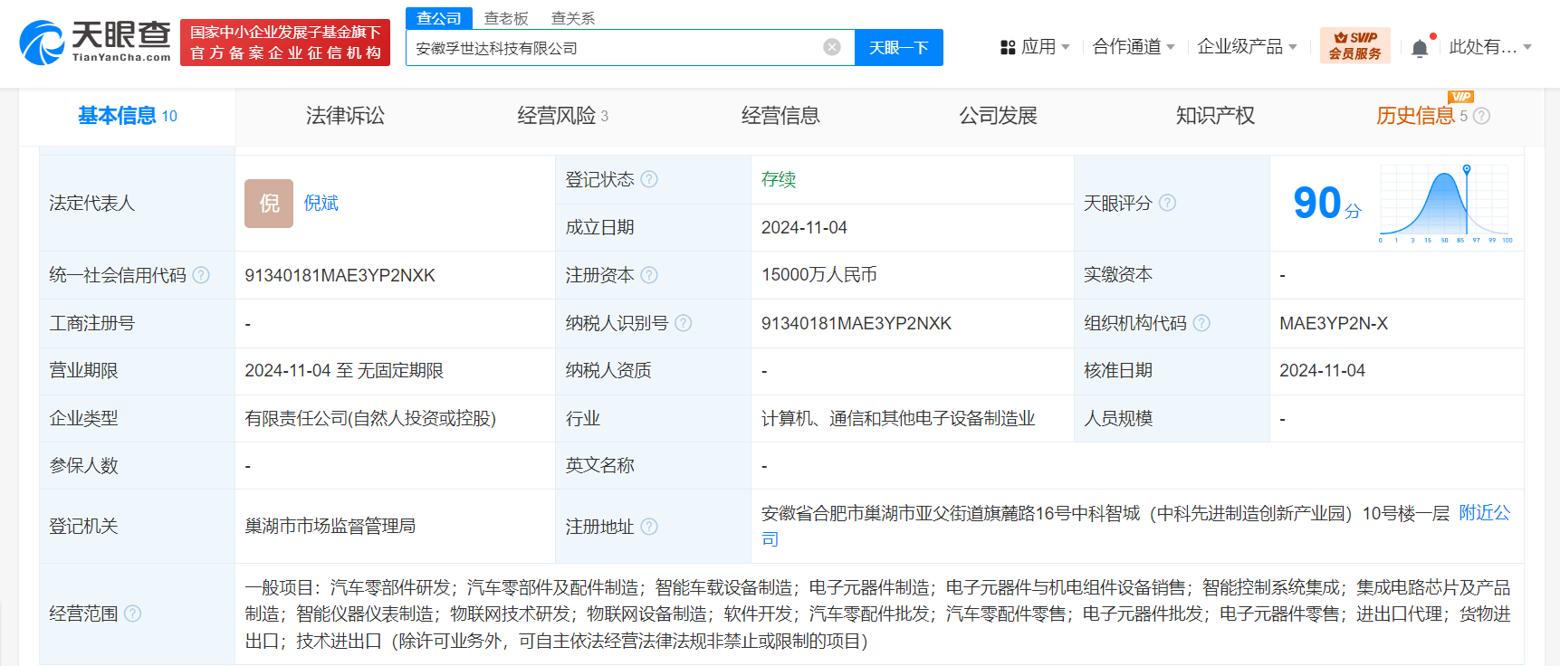天眼查App显示,近日,安徽孚世达科技有限公司成立,法定代表人为倪斌,注册资本1.5亿人民币,经营范围含汽车零部件研发、汽车零部件及配件制造、智能车载设备制造、电子元器件制造、集成电路芯片及产品制造、智能仪器仪表制造等。