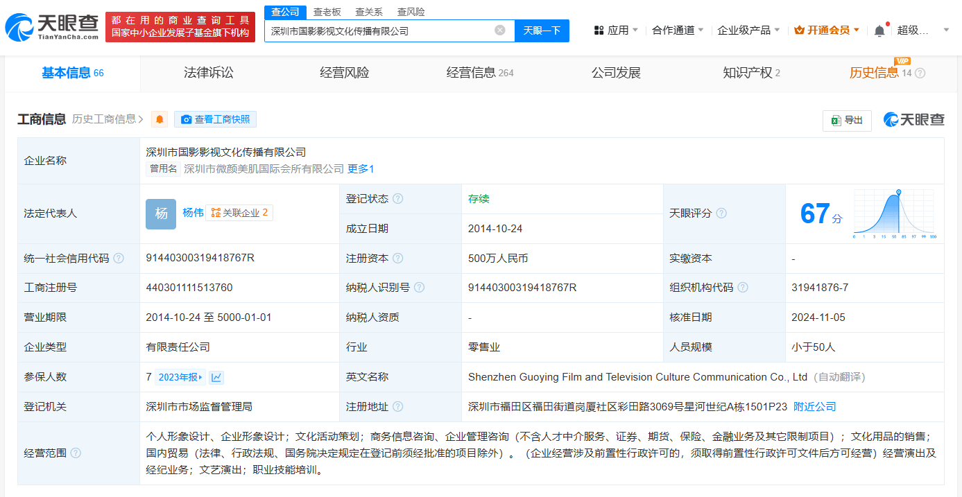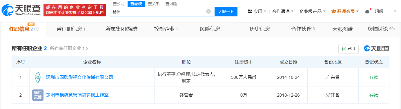 天眼查商业履历信息显示,黄杨钿甜父亲杨伟除近日退出的深圳市水瓷慕美妆贸易有限公司外,还关联深圳市国影影视文化传播有限公司、东阳市横店黄杨钿甜影视工作室。其中,深圳市国影影视文化传播有限公司成立于2014年10月,注册资本500万人民币,由杨伟担任法定代表人、总经理、执行董事并持股80%。今年4月25日,该公司发布减资公告,注册资本将由500万人民币减至2万人民币。变更记录显示,杨伟于2017年6月入股该公司并任职。