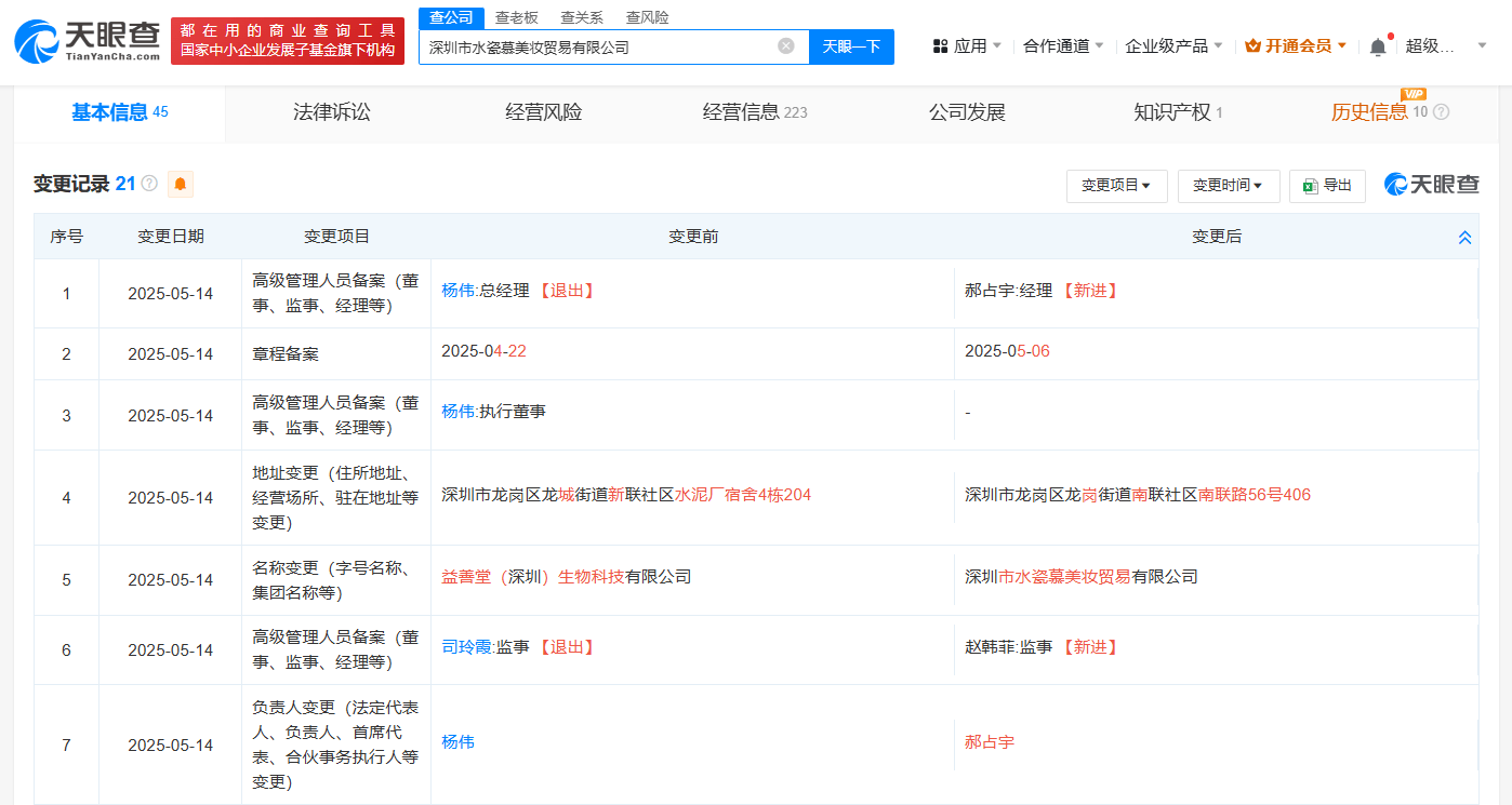 东阳市横店黄杨钿甜影视工作室则成立于2018年12月,杨伟为经营者。值得注意的是,杨伟于近日卸任深圳市水瓷慕美妆贸易有限公司(曾用名:益善堂(深圳)生物科技有限公司)法定代表人、执行董事、总经理并退出股东行列。该公司成立于2020年4月,注册资本1000万人民币。