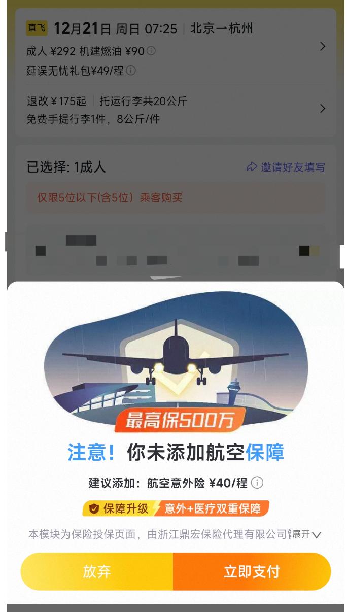 12月19日,一位网友在社交平台爆料称,自己在“飞猪”APP购买机票时遇到了一场隐秘搭售保险的“骗局”,且“正常人不可能识破”。