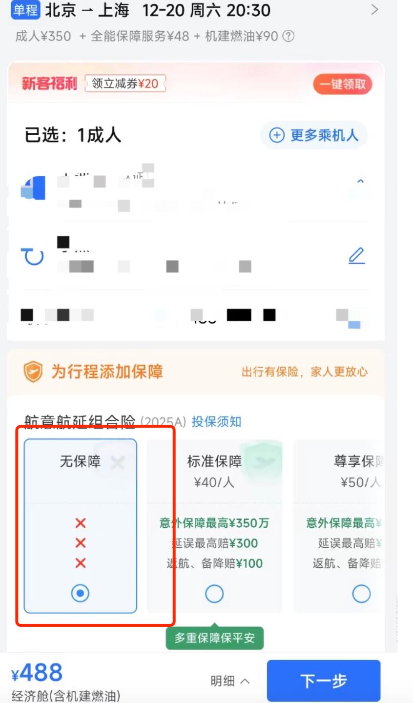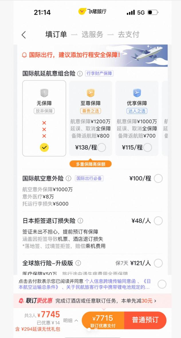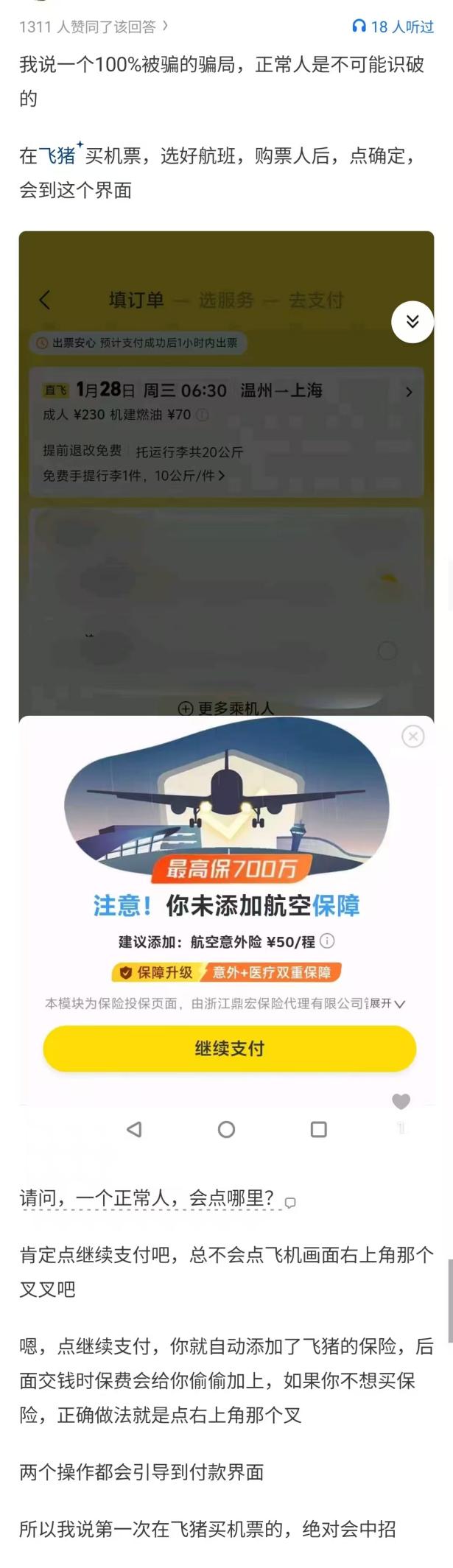 然而,问题恰恰出在这里。爆料者指出,如果你点击了“继续支付”,那么你已经“被自愿”地购买了飞猪推荐的旅行保险。这笔保费并不会在此时明确弹窗提醒你,而是会悄无声息地计入你最终的支付总额中。等你回过神来,可能早已付款成功,绝对会中招。