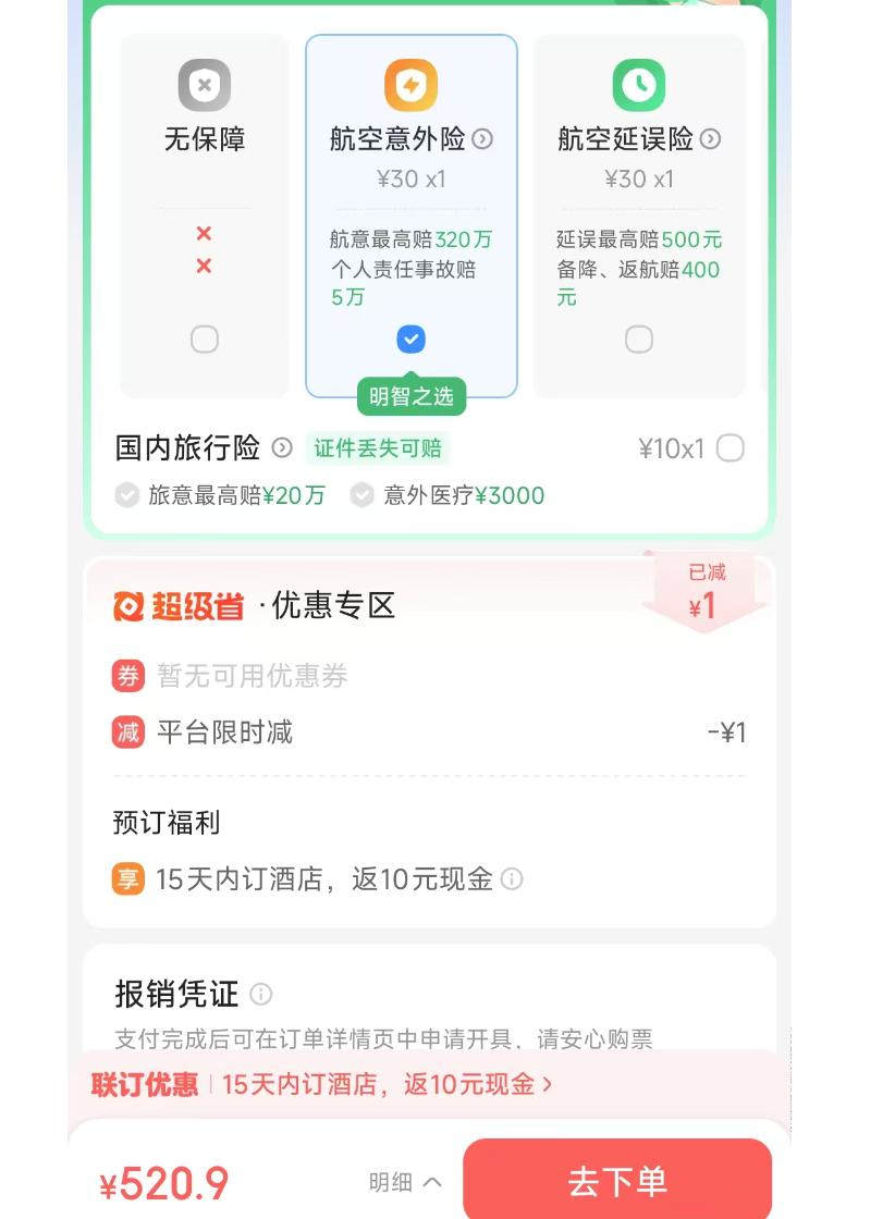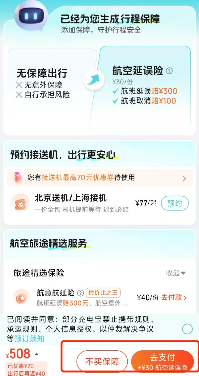 凤凰网财经《公司研究院》通过梳理目前市面流行的旅行APP发现,智行火车票APP同样存在选择航班后,支付界面会默认勾选航空意外险。