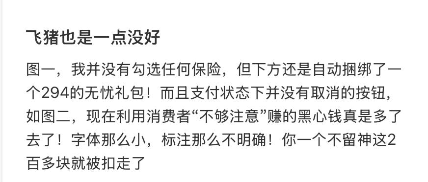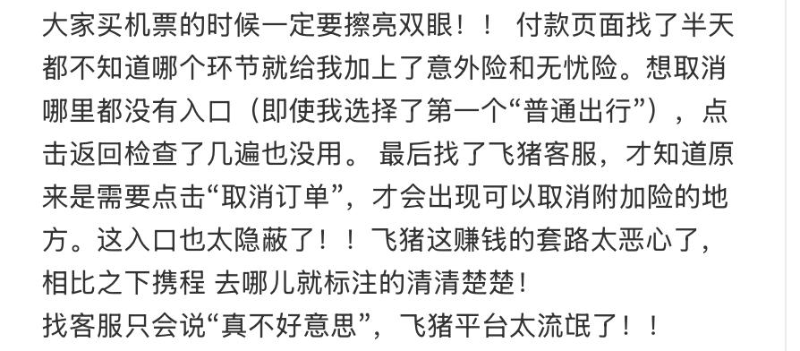 一位用户详细描述了自己的遭遇:“付款页面找了半天都不知道哪个环节就给我加上了意外险和无忧险……最后找了飞猪客服,才知道原来是需要点击‘取消订单’,才会出现可以取消附加险的地方。这入口也太隐蔽了!飞猪这赚钱的套路太恶心了。”