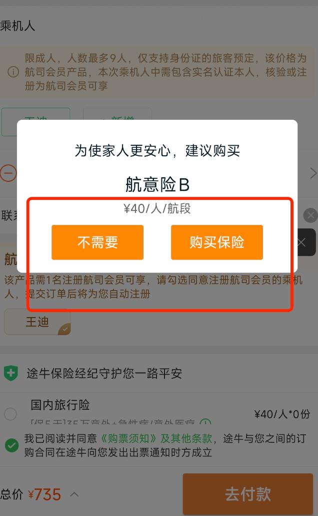 相比之下,途牛旅游APP和去哪儿旅行APP在保险勾选设计上相对透明。途牛在支付界面跳出“购买保险”及“不需要”的选择按钮,去哪儿旅行则明确标注“不买保障”和“去支付”两个按钮。携程APP在支付页面中默认勾选了“无保障”,用户需要主动选择才会添加保险服务。