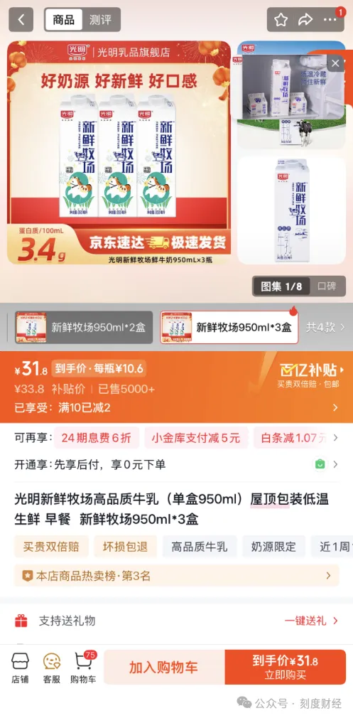 在天猫、京东等电商平台,部分店铺所售产品的标题与详情页,频繁使用低温生鲜、新鲜等表述,而且包装正面占据主导地位的“新鲜牧场”四个大字,远比“高温杀菌乳”几个字更具视觉冲击力。