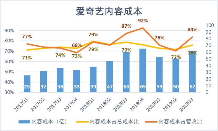 众所周知,2018年被称为“娱乐圈地震元年”,从阴阳合同到天价片酬,PGC平台巨额采购成本的源头浮出水面。19Q3,爱奇艺内容成本攀升至62亿元,占总营收的84%,却仅占总成本的76%。这就意味着其收入连成本都无法覆盖,更遑提费用了。