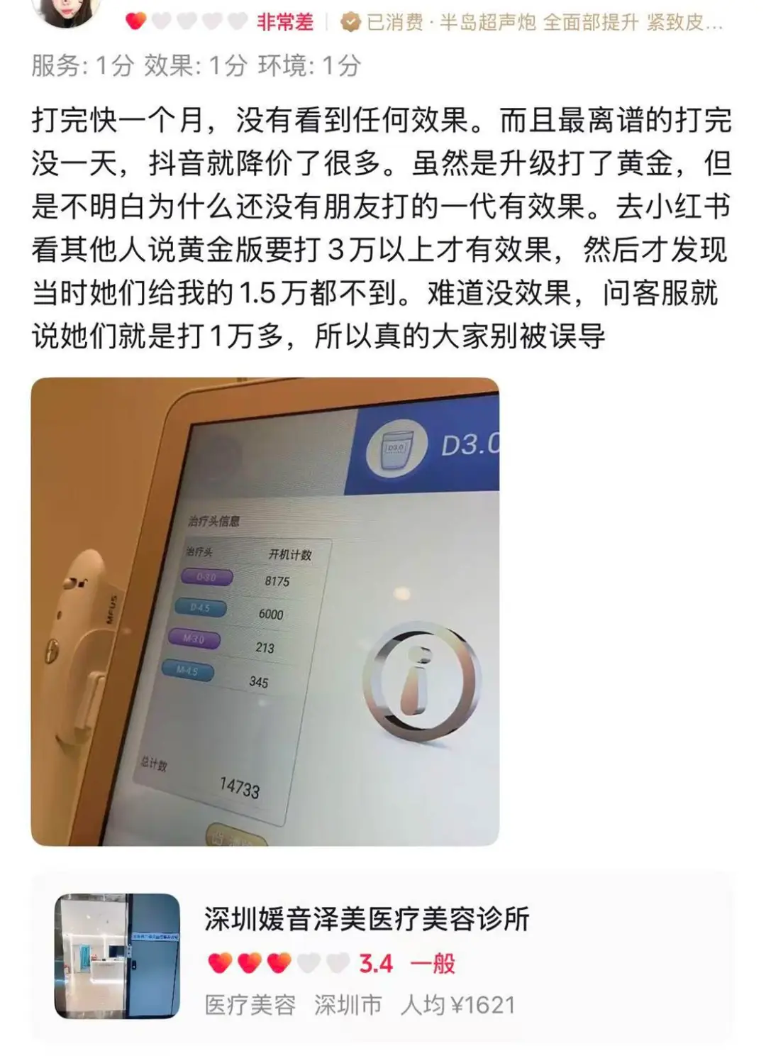 一位消费者在抖音平台痛斥深圳媛音泽美虚假宣传。